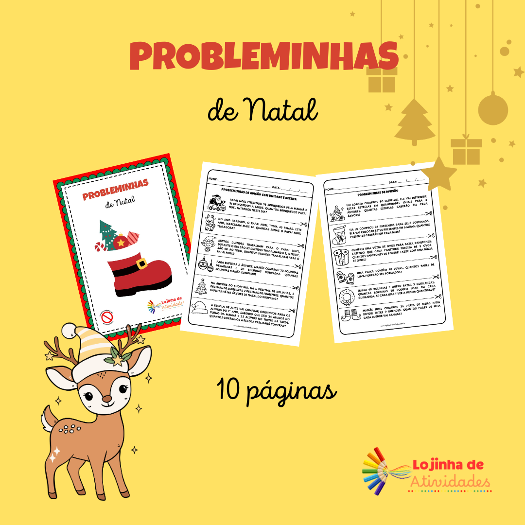 Kit com 10 páginas de probleminhas natalinos envolvendo adição, subtração, multiplicação, divisão e problemas com horas. São 60 problemas para recortar, colar e resolver.